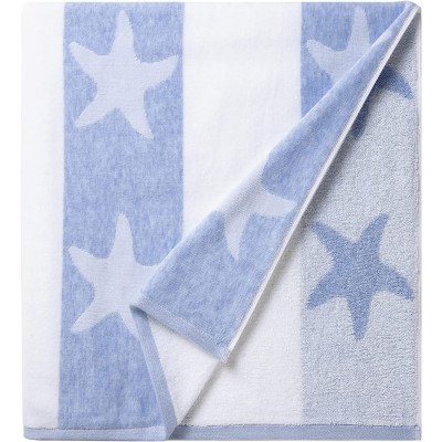 Large Oversized Beach Towel - Velour Cotton 40 x 70 Inch Fluffy Blue Starfish Striped Towel